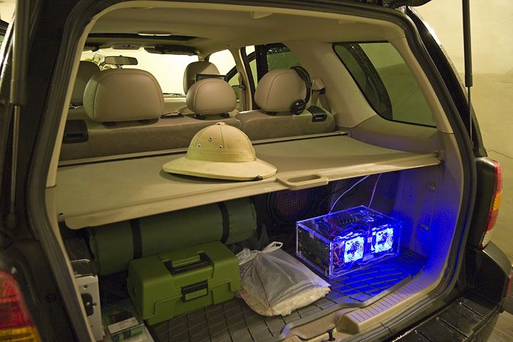 прекрасно тянет мою систему: ASUS P5LD2-SE / CeleronD 2.66 / 2*512Mb DDRII / 100 Gb 2.5" Seagate SATA / SB Audigy SE 7.1 / nVidia GF7300 GS TV / 2*LED Case Fan 80mmВсе это добро запихано в корпус ручной сборки, который пока лежит на полу в багажнике, но в ближайшем будущем бедет закреплен в нише, над аркой заднего правого колеса, вооон таааам на фото видно её - куда провода уходят, и тогда объем багажника будет не занят компом.