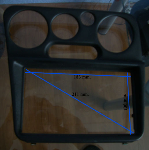 Во вложении моя 2дин панелька. Область для монитора легким движением напильника может увеличиться с 183х106мм (диаг. 211мм) до 189х109мм (ш х в).
