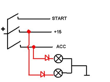 общий центральный вывод на землю, к переключаемым через резистор и светодиоды разного цвета разные плюс 12 (АСС и +12)