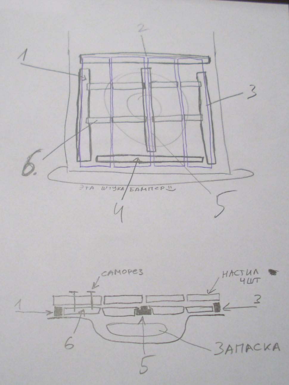 5 - центральное ребро - вынимается если нужно вынуть запаску. Лежит в пазах ребер 2 и 4... и не шевелится там. Так же опирается на пол с краю и на диск запаски в центре. Это силовая рама конструкции. Настил из 4 полос фанеры кладется без промежутков на эту раму. В большинстве случаев этого достаточно. Ребрышки (6) идущие поперек багажника дают дополнительную жесткость и при сильной нагрузке на настил, они упираются в решетку и в пол, не давая фанерному настилу прогнуться и задавить оборудование. Они закреплены к настилу и вынимаются вместе с ним. Коврик, наклееный на настил, работает как петля-удерживает части настила вместе, но позволяет им отгибаться поодному. В ребрышках снизу пропилены "проходы" для проводов. Фоток нет - делали как-то наскоком из того что было... меньше 3х часов ушло с пивком. |