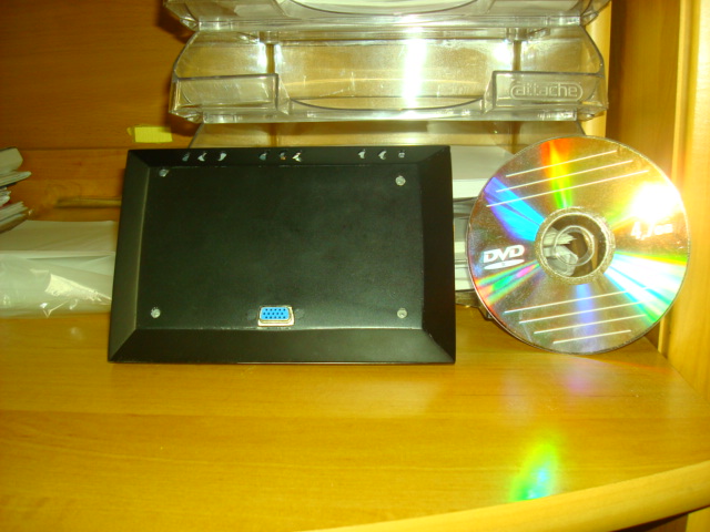 Потом из всего собраного собрал вот такой монитор(в жизне он смотрится на много лучше) Все провода ( питание монитора, тач, кнопки меню монитора, видео) были выведены в один VGA разъем (15 пино хватило в притык).