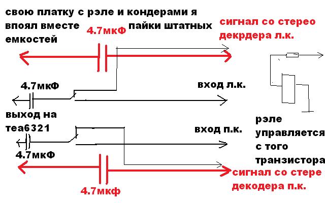 правельно заметил.действительно сигнал с трактов приемников идет на один и тот же вход комутатора.по моему ТДА 8362.как АМ так и ФМ сигнала.на другой идет сигнал с лентопротяга.на третий по аналогии должен идти с ченжера я не углублялся.так вот рэле и разеляет сигналы АМ и ФМ перед комутатором