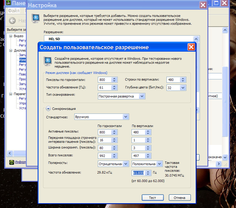 попробуй манипуляцию из 73 поста, стрипом подгони разрешение, и пропиши в виндовс. п.с только что попробовал средствами драйвера видяхи, у меня нвидия-9800, создал 800х480 60гц, как и у тебя невлазит по горизонтали, поставил 61гц применил, всё чётко стало,истина гдето там.