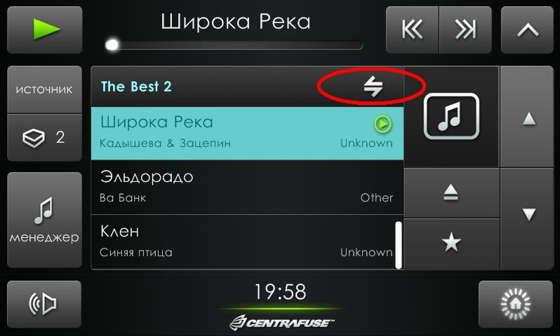 Если не ошибаюсь, во время проигрывания нажать (1 раз или 2 подряд) на верхнюю строку где показывается информация о песне. Меняется режим очередности воспроизведения. Нужен "случайный выбор".