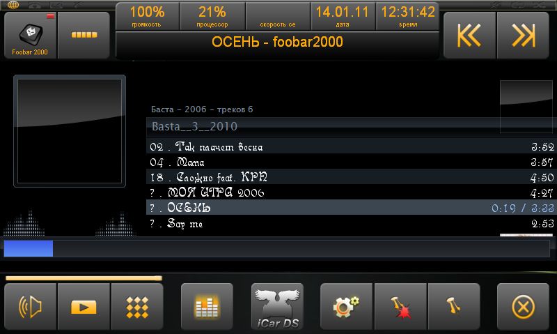 кнопка с рисунком папки открывает встроенный медиа-браузер. В этом медиа-браузере есть еще две кнопки "Загрузить папку" и "Загрузить файл" соответственно выбираем что нас интересует и жмет нужную кнопку, причем при выборе папки с музыкой в нее необходимо войти. После чего нас выкидывает обратно в экран foobar (вот он главный глюк встраивания фубара в icar). Затем перечитываем в плейлист фубара выбранный файл или папку, нажав в верхнем меню экрана foobar "галочка" или "плюсик" соответственно. - по скину: В теме файл fontmainbotton.txt отвечает за шрифт, размер и цвет по трем составляющим в названии программ. В теме файл _сf_fontbar.txt отвечает за шрифт, размер и цвет по трем составляющим текста индикаторов в верхней части, бегущей строки, цвет текста на заставках перед запуском приложений. |