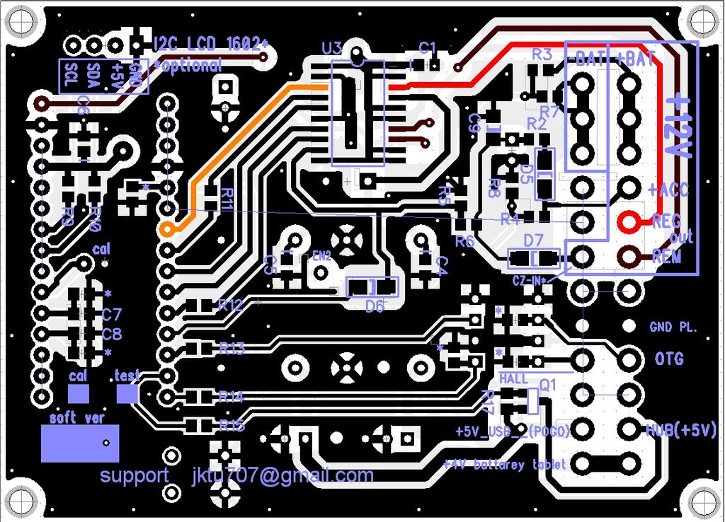 Далее, через паузу (определенную в программе процессора) после включения ACC включаем (+5V (POGO(USB)) на пого пин ( в 7-2012) либо на юсб (+5В) . Для этого включаем логическую единицу (+5В) на D2 ардуины. Напряжение идет через R16 на подпаянный на плату ДС-ДС-2 дополнительный управляющий провод (EN2). Поскольку напряжение +12В на входе уже есть, на выходе дс-дс появляется настроенное заранее питание 5,0В. Если напряжения на выходе дс-дс2 (5В) нет, а на входе (+12В) есть, следует проверить управляющее напряжение в точке EN2 (+5В), следует проверить (или временно выпаять) стабилитроны ZD1, ZD2 (могут закоротить при самостоятельной подстройке напряжения выше 5,6В) Также проверить С3, С13. Cледующая часть