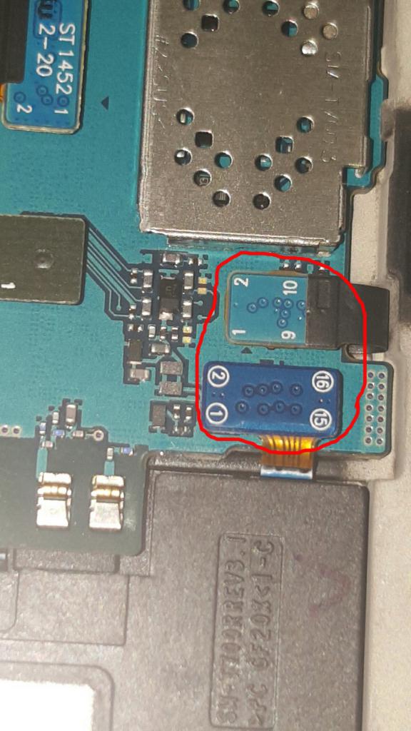 1. Видимая верхняя сторона платы. Красным - точное место срабатывания магнита. В этом месте расположены защелки двух шлейфов, больше никаких деталей нет. Синим - единственная трехногая деталь "поблизости", но она никак на магнит не реагирует.