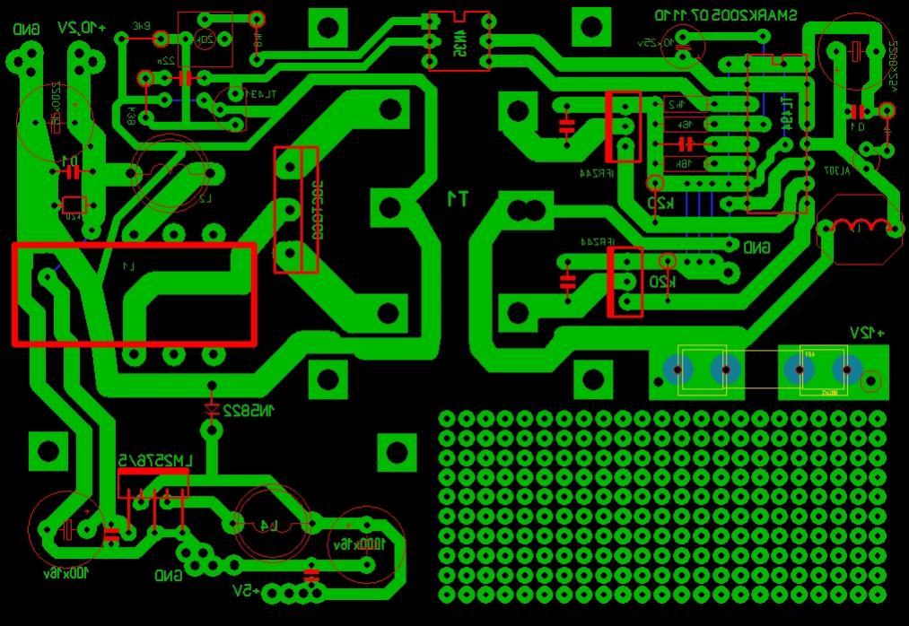 В процессе запайки деталей. Схема из соседней ветки "DC-DC 12в. 5-10А". Только сделал количество витков для 10,2 вольта, плюс добавил на канал 5 вольт через LM2576/5. Схема господина Hmelik. Печатку наполовину тоже у него содрал и подравил для себя. Просьба заценить и поругать если что.