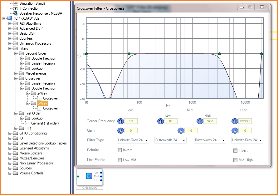 2. Можно каскадировать фильтры увеличивая порядок. Я не знаю Ваших задач, но ничего криминального, чтобы использовать Mid в 3-полосном кроссовере я не вижу, для стерео - разумеется два блока. Если схема обработки не очень навороченная, т.е. быстродействие позволяет, то лучше использовать Double Precision меньше ошибок к младших разрядах и т.д. Все же 16-битный поток с CD - это не верх качества, а тут еще и младшие разряды корежить... Правда, все равно сигнал сначала расширяется до 24-бит, но все же... |