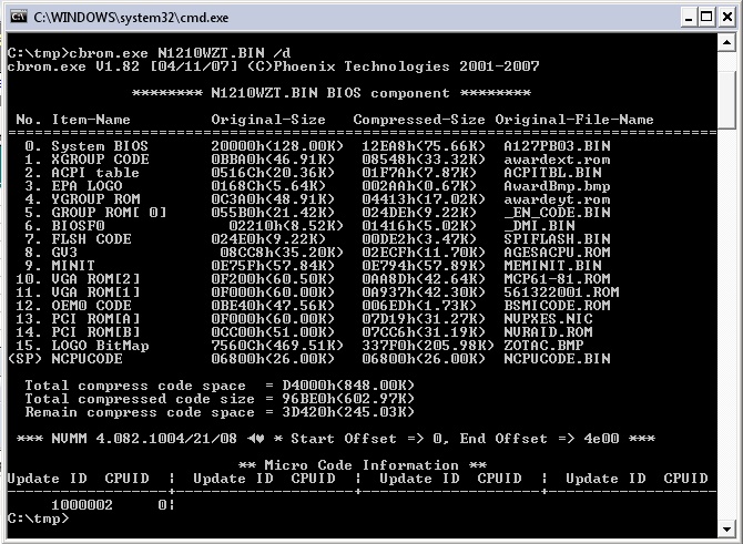 Позволяет менять любые блоки в BIOS от Phoenix/Award В частности лого от ZOTAC было выковыряно легко. Закатал все обратно завтра опробую. если заработает поделюсь как этим пользоватся. |