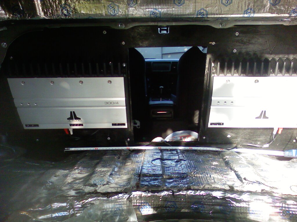 Для крепления усилителей JL AUDIO 300/4 и 500/1 изготовлена панель из фанеры (с сохранением лыжного лючка)