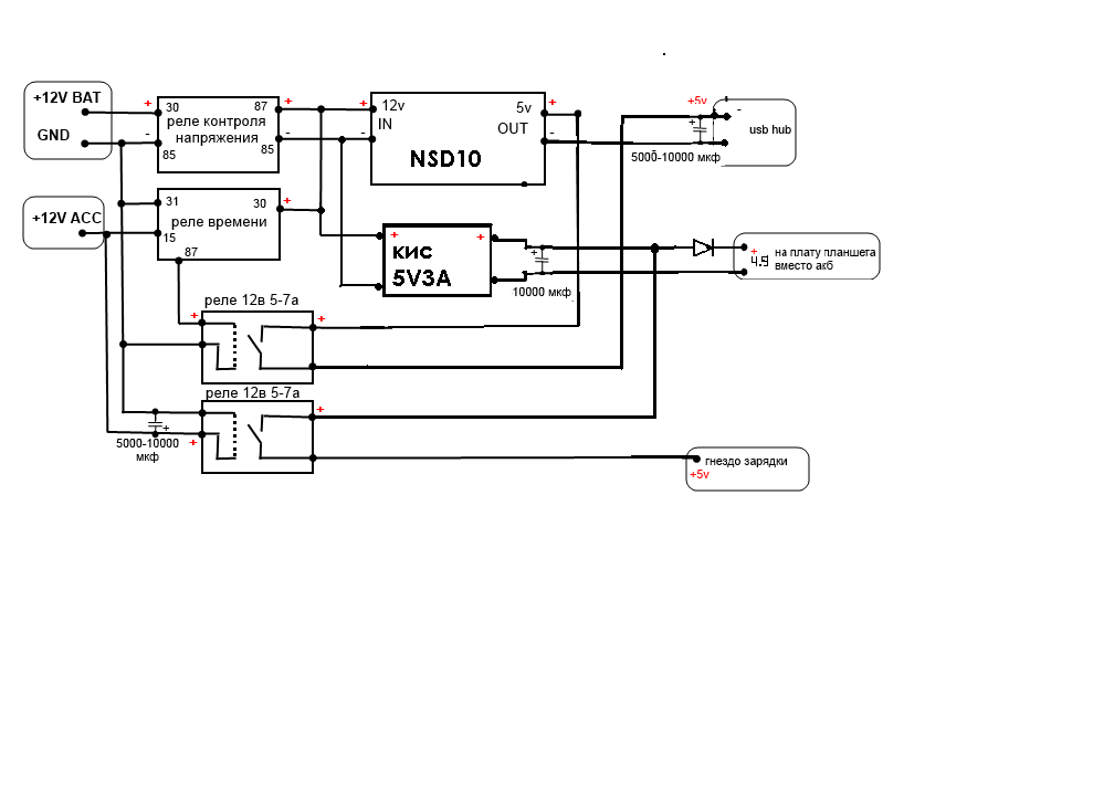 , Методом проб и ошибок была убита NSD15, но в запасе остались КИС 3А-ый и NSD-10. КИС будет питать планшет вместо батарейки и подавать 5в в гнездо зарядки. NSD-10 полностью в распоряжение хаба. Взял за основу схему БП Rage2 и немного подправил. Т.К. в наших краях вечные проблемы с ассортиментом и наличием, то вариант про поехал и купил нам только снится.