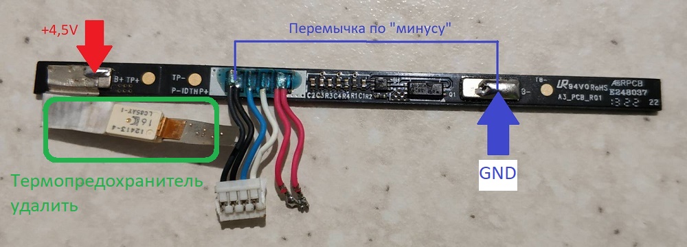 Попробуйте подключить по схеме, как для Nexus-а: контроллер оставляете, перемычка между клеммой "B-" и двумя чёрными проводами на разъёме, провода от преобразователя "+4,4V" на контакт "B+", "минус" от преобразователя на контакт "B-". Разъём защёлкиваете на мат-плату. Напряжение выше 4,7V не поднимайте. Термопредохранитель можно отрезать от контроллера. |