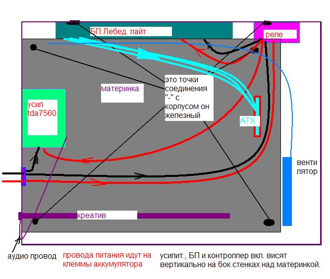 Помогите разобраться с проблемой шума генератора в колонках при подключении кабеля звуковухи к усилителю. (все в одном металлическом корпусе). провода питания идут напрямую от аккумулятора и "+" и "-". больше с корпусом авто нигде не соединяются. еще слышна работа компа, но это пока не обсуждается(на фоне генератора они тише). Если джек из звуковухи выдернуть в колонках тишина. Красным и черным показаны провода питания "+" и "-" соответственно. Кстати очень шумит в колонки вентилятор второй (первый не слышно), пока отключил, но без него система греется.