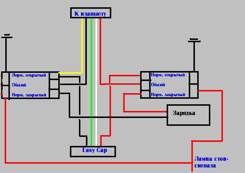 Буду пробовать другой вариант - во вложении. Ядро буду ставить без поддержки OTG+Charge, т.е. будет самый обыкновенный режим питания. На схеме два реле, которые будут одновременно включаться от стоп-сигнала (можно выставить задержки) Принцип такой - идет зарядка, включается задняя передача, активируются реле, через которые рвется питание и масса зарядки, замыкается питание EasyCap и активируется OTG (замыкается масса и ID). После отключения все возвращается на круги своя. В таскере настроить правило, что если пропадает зарядка, но активен EasyCap Viewer, экран не гасить. Как думаете, будет работать?