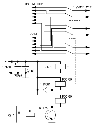 Схема простейшего аудиокоммутатора на 6 каналов. Реле любые. Для ориентировки РЭС 60, справочные данные по ним есть тут и тут. В зависимости от напряжения включения реле, выбирается питание блока, 5 или 12 вольт. Разьём на моей печатке разведён на 5В.