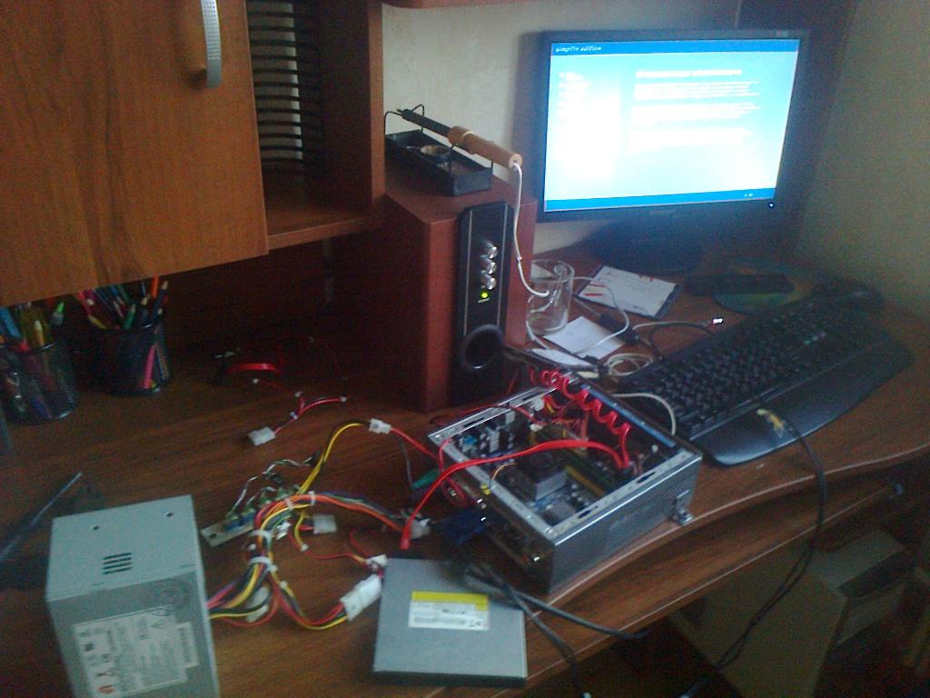 Для высвобождения места - кастрировал корпус компа и отказался от DVD нафиг, теперь вместо DVD будет подвеска для HDD, + добавил еще 2 гига оперативки - итого на борту 4 гига... На 2 последних фотках видно, питание с м2атх впаяно в плату - в результате кастрации корпуса, переехал БП, а его разъем упирался в материнку, и пришлось дремелем (затрахался) вырезать его нах, и впаивать провода прямо в плату... В итоге корпус кастрирован на 7.5 см... а то под торпедой все было в притык, сейчас посвободнее будет...
