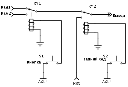 На 2 входа - вообще одного 12В реле хватит. Стоить это будет - реальные копейки, и ждать ничего не надо. Земли сигнала объдинить. Выход на монитор - на центральный контакт, кзх - на NO, второй вход - на NC, один конец обмотки на массу, второй - на датчик заднего хода.