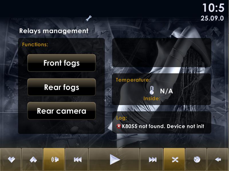 Управление слаботочкой я сделал так: описанную выше плату K8055 подключил к USB. На сайте производителя есть DLL-ка для управления этой платой и так же мануал для подключения релюх. Вообщем с помощью этого всего можно сделать так чтобы с компа включать и выключать нужную релюху. А уже эта релюха подключена к соотв. цепи в авто (камера, задние противотумки).