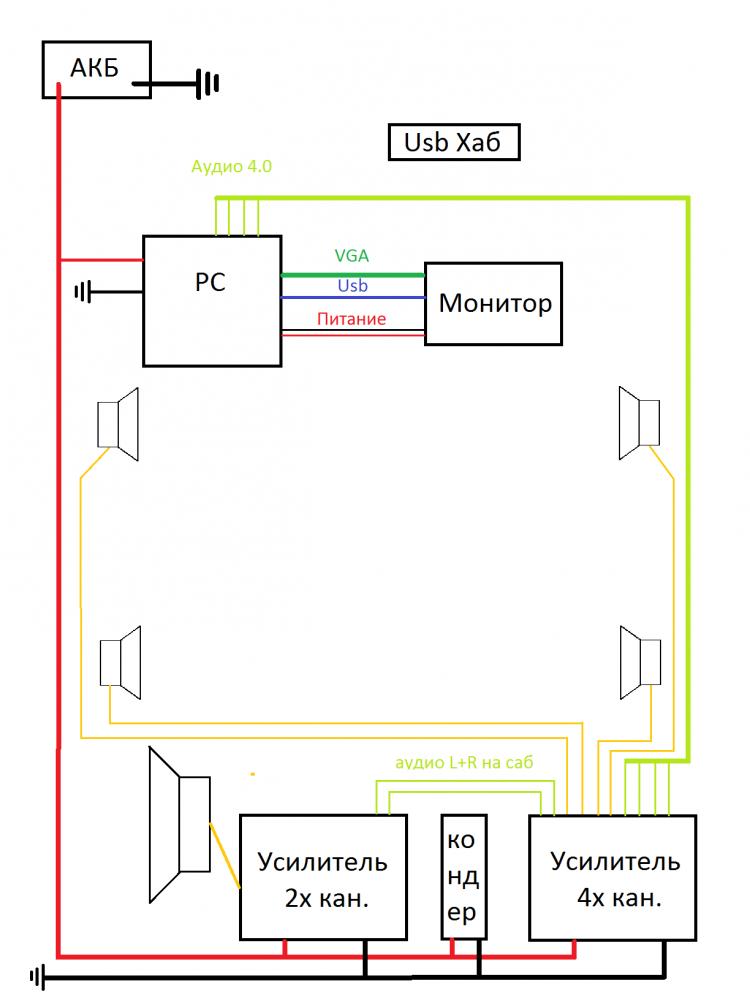 Для примера приведу новую и хочу узнать как поведет себя минус в 2х точках!??? исходя из личного опыта могу сказать что вой от генератора возникает только в связке пк-магнитола, а пк-усилитель реже! Скорей всего это связано с тем что почти во всех нормальных усилителях минусовые шины разделены резистором и в самом усилители есть гальваническая развязка ,т.к. стоит трансформатор!