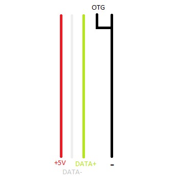 Вот мой разобранный ОТГ кабель. Как видите, тут нет возможности добраться до 4-го пина, тут только 5-й(чёрный провод). Разбирать дальше некуда.