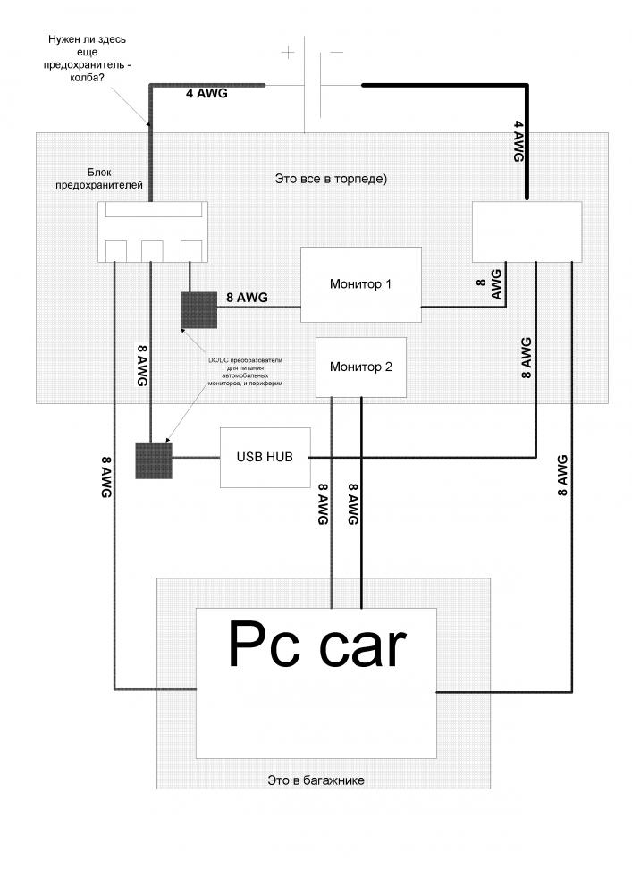 Очень нужна консультация по поводу подключения питания на монитор и далее всего остального. Если кому не сложно напишите какие провода лучше взять и как подключить и к чему. У меня предсталение такое взять питание с аккумулятора + и - завести в салон проводами сечением 16. в салоне установить разветвитель от которого пойдут провода сечением 10 на комп который поставлю в багажнике и второй монитор. первый подключу через бп компа. Теперь вопрос нужны ли такие толстые проводи или хатит 10 и затем 8. Второй вопрос как подключить второй моник. |