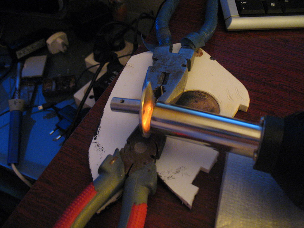 Изготовление съёмных креплений осей. Для того, чтоб фланцы осей не выпирали из стенки статической части монитора, было решено вплавить эти фланцы в стенку, для этого был применён фен, фланцы были нагреты до 480 градусов в течении 10 минут, и приложены под некоторым усилием к стенкам. С другой стороны стенок так-же вплавлена пластина, в которой нарезана резьба на 3, для крепления осей. Такая конструкция обеспечит съёмность подвижной части с статической. Последний раз редактировалось ZXprSL; 05.05.2011 в 08:22. |