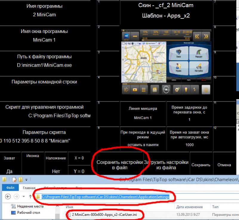 Настройки миникама нужно сохранить нажав кнопку "сохранить настройки в файл". Он сохраняется в "C:\Program Files\TipTop software\iCar DS\skins\Chameleon\ApplicationSettings\". На фото видно.
