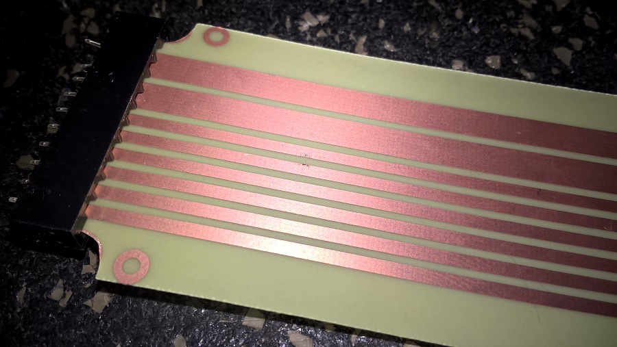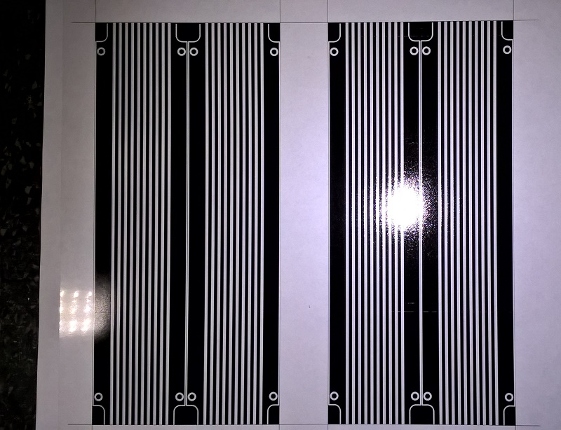 Для одного из вариантов механизма пытался найти готовый гибкий шлейф с шагом 2.54мм, но не смог. Решил сделать самодельный. На просторах интернет-рынка случайно приобрел фольгированный стеклотекстолит ФТС-2-20Б толщиной 0.08 мм. Качество листов, размером 250х250мм просто плачевное - царапины, вмятины, местами пятна патины... Если правильно прочитал на бирке - произведено в 1984 г. Но это все же лучше, чем ничего! Платы делаю с использованием фоторезиста. Метод описывать не буду - в инете полно информации. Шаблон печатаю на струйном принтере на пленке Lomond. Печатаю два негатива и затем накладываю друг на друга - для более плотного цвета. Травлю в хлорном железе.