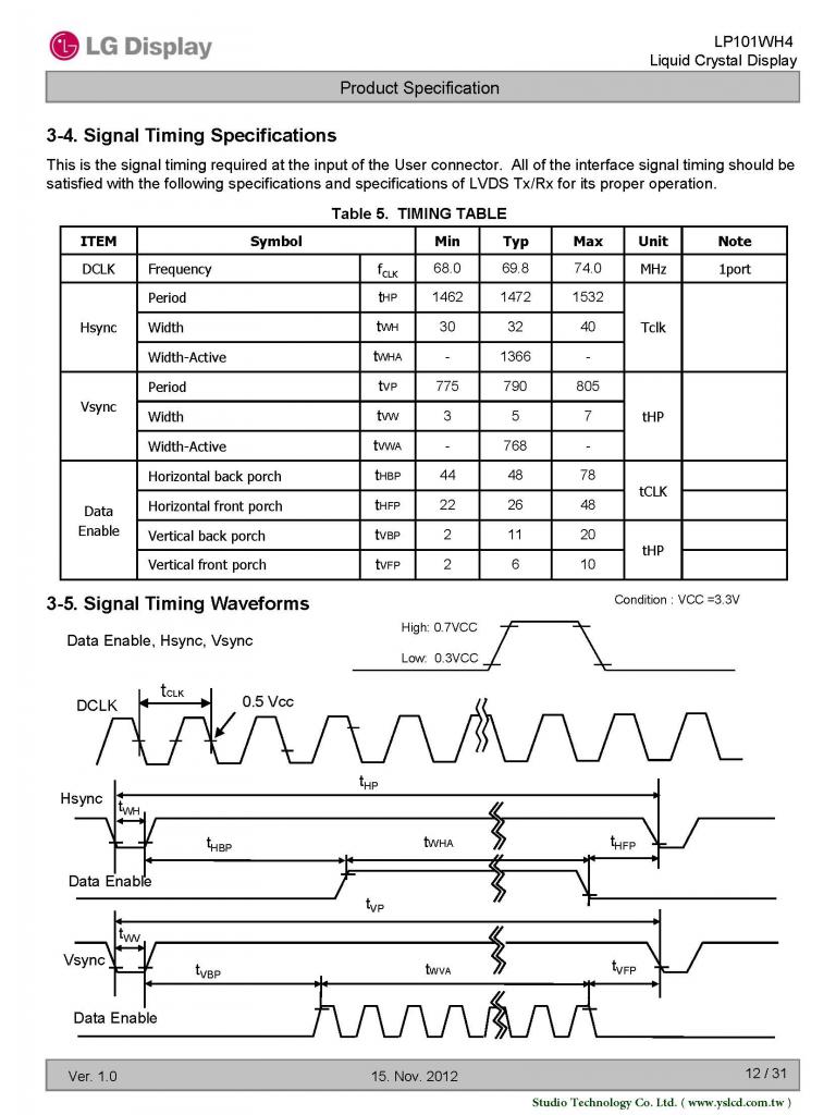 Посмотрите пожалуйста, правильно ли я значения для edid-а из пдфки вычленил? H. Start of Sync Pulse = H. Active Pixels + H. Front Porch = 1366 + 26 = 1392 H. End of Sync Pulse = H. Start of Sync Pulse + H. Sync Width = 1392 + 32 = 1424 H. End of Blanking Interval = H. Active Pixels + H. Blank Pixels = 1366 + 106 = 1472 V. Start of Sync Pulse = V. Active Lines + V. Front Porch = 768 + 6 = 774 V. End of Sync Pulse = V. Start of Sync Pulse + V. Sync Width = 774 + 5 = 779 V. End of Blanking Interval = V. Active Lines + V. Blank Lines = 768 + 22 = 790 H. Active Pixels = 1366 H. Front Porch = 26 H. Sync Width = 32 H. Start of Sync Pulse = 1392 H. End of Sync Pulse = 1424 H. Blank Pixels = 106 H. End of Blanking Interval = 1472 V. Active Lines = 768 V. Front Porch = 6 V. Sync Width = 5 V. Start of Sync Pulse = 774 V. End of Sync Pulse = 779 V. Blank Lines = 22 V. End of Blanking Interval = 790 Смущает, что в ней нет ни слова о H. Blank Pixels и V. Blank Lines, их взял из расчета Period минус Active... Спасибо. |