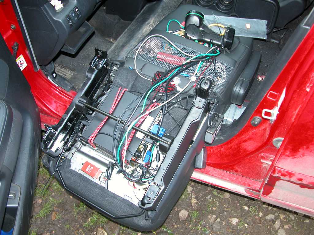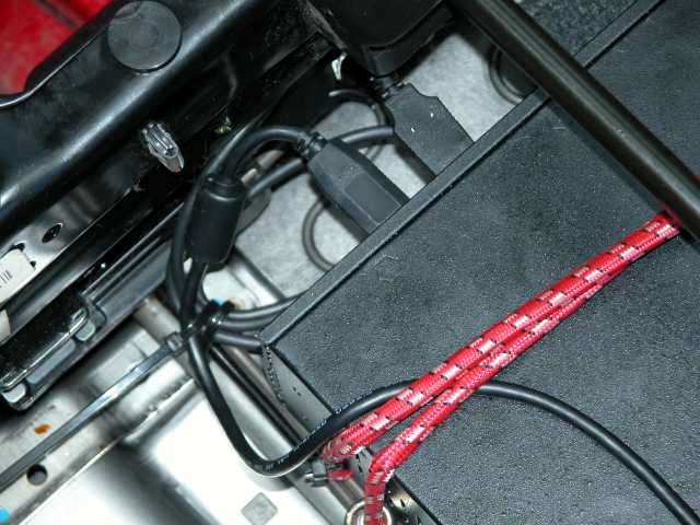 К принайтовленному системнику подключил разъемы всех кабелей. И получилось очень аккуратно. Кабели ушли под сиденьем под ковролин и к борту через порожек под торпедо. Остался запас по длине, чтобы можно было поднять кресло опять. Если заглянуть под сиденье не видно проводов вообще - только системный блок.