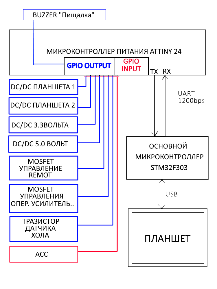 + появилась возможность управлять микроконтроллером питания напрямую с планшета (задавать различные задержки и т.п), ATTTINY24 будет подключен к основному контроллеру STM32 по UART в свою очередь STM32 к планшету по USB для настройки с приложения. Ещё заказал станок TVM802B, буду собирать устройство у себя) |