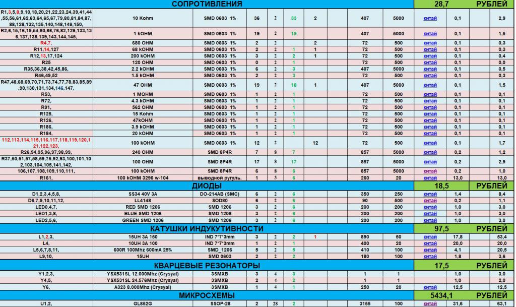 Замучился всё писать и считать на бумажках, всё забил в Excel так как количество комплектующих очень много, трудно уследить за всем). 2 дня ушло чтоб найти все необходимые комплектующие и составить таблицу. В общем то делюсь файлом, там сможете посмотреть откуда берётся цена на устройство, из каких компонентов состоит их количество цены и ссылки на комплектующие. Все подсчёты делаются автоматический. Количество комплектующих меняются в зависимости от количества запятых в поле "метка на плате" также и подсчёт цен и т.д. Общее количество компонентов на одной плате получилось 475 шт из них штук 100 приется паять в ручную. |