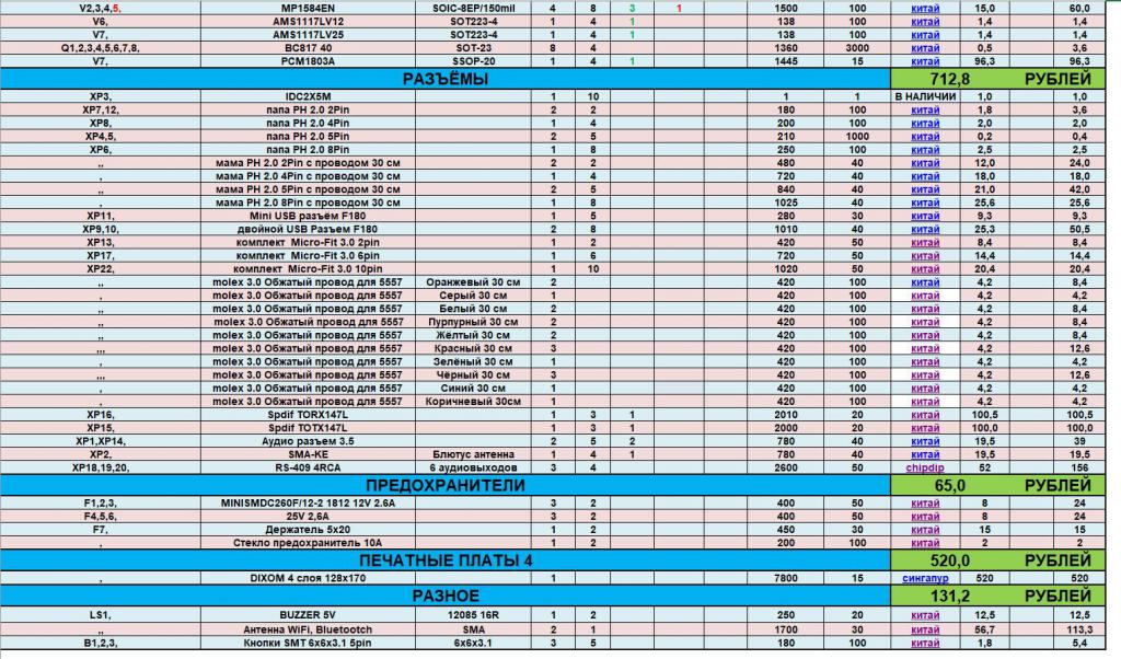 Замучился всё писать и считать на бумажках, всё забил в Excel так как количество комплектующих очень много, трудно уследить за всем). 2 дня ушло чтоб найти все необходимые комплектующие и составить таблицу. В общем то делюсь файлом, там сможете посмотреть откуда берётся цена на устройство, из каких компонентов состоит их количество цены и ссылки на комплектующие.