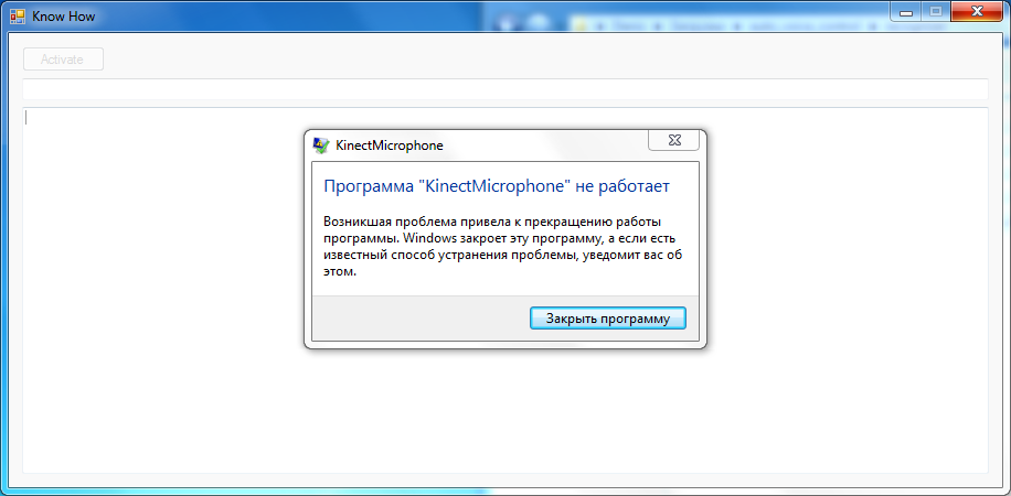 Сигнатура проблемы: Имя события проблемы: CLR20r3 Сигнатура проблемы 01: kinectmicrophone.exe Сигнатура проблемы 02: 1.0.0.0 Сигнатура проблемы 03: 50fc29a6 Сигнатура проблемы 04: mscorlib Сигнатура проблемы 05: 4.0.30319.19050 Сигнатура проблемы 06: 50b5a7b2 Сигнатура проблемы 07: 161a Сигнатура проблемы 08: 70 Сигнатура проблемы 09: System.IO.FileNotFoundException Версия ОС: 6.1.7601.2.1.0.768.2 Код языка: 1049 Дополнительные сведения 1: 5e19 Дополнительные сведения 2: 5e19ee1c696ef6172247e218fb962904 Дополнительные сведения 3: e0f2 Дополнительные сведения 4: e0f232445a44e91e718244947c5b3175 Ознакомьтесь с заявлением о конфиденциальности в Интернете: http://go.microsoft.com/fwlink/?link...8&clcid=0x0419 Если заявление о конфиденциальности в Интернете недоступно, ознакомьтесь с его локальным вариантом: C:\Windows\system32\ru-RU\erofflps.txt Windows 7 home basic x64 я думаю проблема в .NET framework если запустить программу и закрыть то пишет это : Последний раз редактировалось saber_vs; 22.01.2013 в 19:24. Причина: добавил |