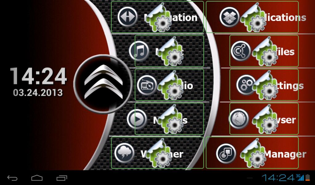 Всё что видим (кроме часов и виджета музыки) - картинка сделанная в фотошопе. Часы сделаны посредством 1010time. Тут внешний вид зависит от вашей фантазии, лично мне нравятся часы попроще. Часы установлены в качестве живих обоев, подложка - созданная картинка Установлен лончер Nova, сетка ярлыков - 5х12 для более точного расположения виджетов, все доп. рабочие столы отключены. Далее посредством Desktop Visualizer созаны виджеты с прозрачными картинками и помещены поверх каждой надписи. Плеер - виджет от PowerAMP суженый до минимума. В последствии планируется от него избавиться, так как будут подключены резистивные кнопки на руле. |