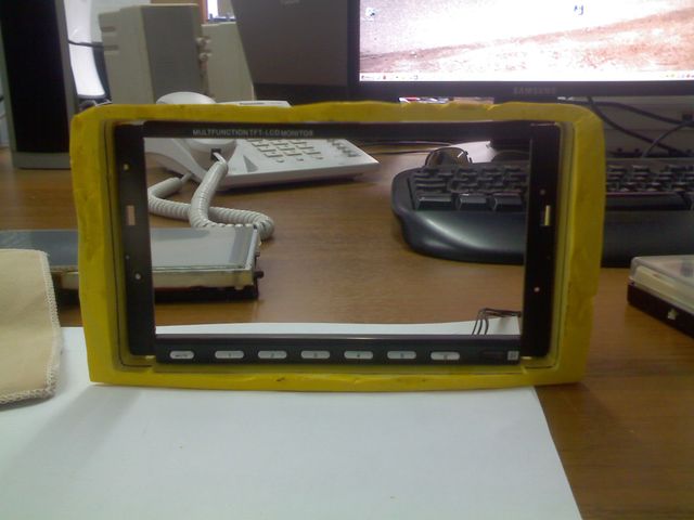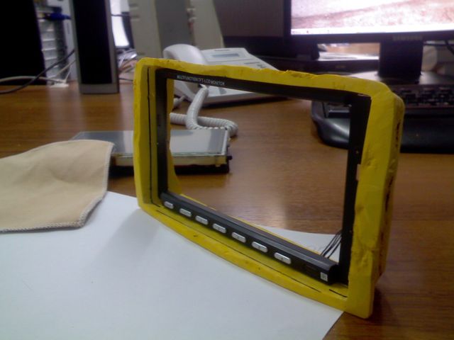 Нашел упаковочный материал из коробки с монитором... какой то вспененый полиэстер чтоли... мягкий - легко режется скальпелем... решил попробовать сделать из него набросок для переходной рамки, чтобы оценить на много ли лучше будет смотреться экранчик....