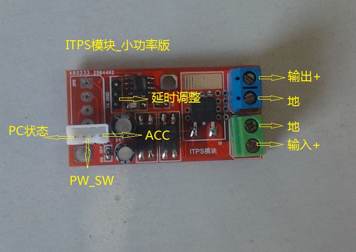 Гугл перевод: Инструкции для модуля ITPS (третье издание _ улучшено энергопотребление _ улучшено) Во-первых, функция: Модуль ITPS может задержать выходное напряжение после 10 секунд подключения ACC и подать на материнскую плату компьютера сигнал включения питания. После отключения ACC через 30 секунд модуль ITPS инициирует выключение компьютера в соответствии с состоянием компьютера. После выключения компьютера, Модуль задерживает выходную мощность на 120 секунд. Выше три раза можно отрегулировать в соответствии с потребностями пользователя, а максимум можно отрегулировать до 9 минут. Выходная мощность: 40 Вт - 60 Вт (тепловыделение на основе тепловыделения), без вспомогательного тепловыделения при токе менее 2А Входное напряжение: 8 В <напряжение <14,4 В Выходное напряжение: то же входное напряжение Напряжение на клемме ACC: то же входное напряжение Состояние ПК +: 5 В - 15 В Во-вторых, схема подключения: