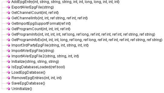 ![]() радио ловит ничего, а ТВ отвратительно, но сейчас не об этом. Рылся на многих форумах в попытках понять кто как подключает данные устройства и понял - плохо дело. Думаю прикрутить данное устройство через радио плагин, который сам напишу. Нужен совет - кто нить имеет Avermedia SDK для общения с драйверами устройства? SDK на сайте Avermedia за деньги... Я нашел SDK от 2004 года на mp3car, но чето уж больно старые... SDK для CF есть, благо свободно распространяется. Еще в папке AvertTV есть OCX файлик AVerEpgMgr.dll. В нем нашел классы IEpgImportUtil и IEpgMgr, а в них методы (см. скриншоты). Может удастся совместно разобраться и создать плагин?
