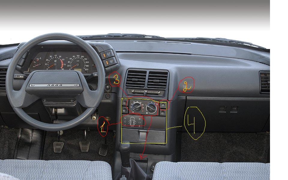 в планах - дублирование всех необходимых кнопок (вверх-вниз-влево-вправо, интер, "мой компьютер", пуск и т.д.) на центральную консоль, консоль полностью хочу убрать, выкинуть, полезного в ней вижу только несколько индикаторов об ошибках, кнопка включения аварийного сигнала и крутилки печки. Индикаторы(на рис.-1) без труда можно вывести на новую панель, то же самое можно сказать и про кнопку "аварийки"(на рис.-2). Крутилки печки убираю вниз(на рис.-3), мафон выкидываю, вместо него усил.
