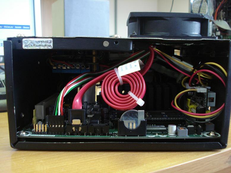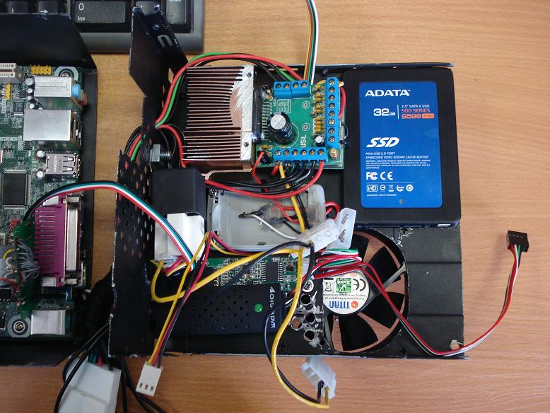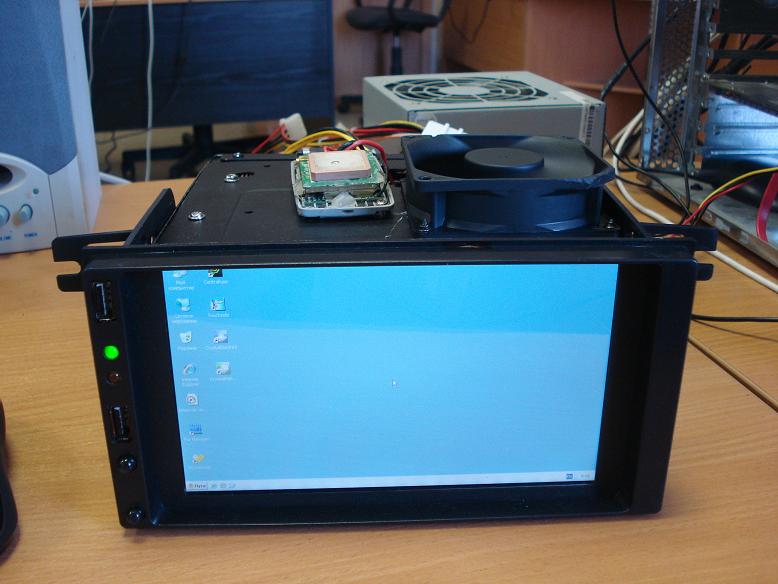 Упаковал все в корпус сделал охлождениме. Питание и ACC беру со штатного разъема, через реле. Вывел сразу подключение штатных колонок на заднюю панель. Винчестер купил всетаки 32GB 2.5' ADATA AS596TB-32GM-C. С возможностью подключения через usb. Вывел эту возможность на морду девайса, так сказать сервисный разъем для быстрого бэкапа и востановления образа. XP заработала на нем шустренько, 230 mb/s чтение 60mb/s запись. Попробую сегодня на Win7. GPS приемник вынес наружу для лучшего приема (установится антена упакую обратно в корпус). Инсталяция в авто не загорами)