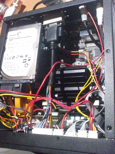 В итоге когда дождался дисплея, купил другую мать у которой есть все три выхода(HDMI, VGA, DVI) Останется на второй дисплей =) Для винта 2.5 в корпусе есть отверстия и болтики для крепления на крышку или на бок корпуса. Я подвесил винт боком на 2 болта с боку корпуса. Про блок питания я писал выше. На данный момент он засунут в разъём ATX и вылазит из него на пару сантиметров. Жду новый, этот не умеет работать со штатным напряжением. На второй фотке установленный БП |