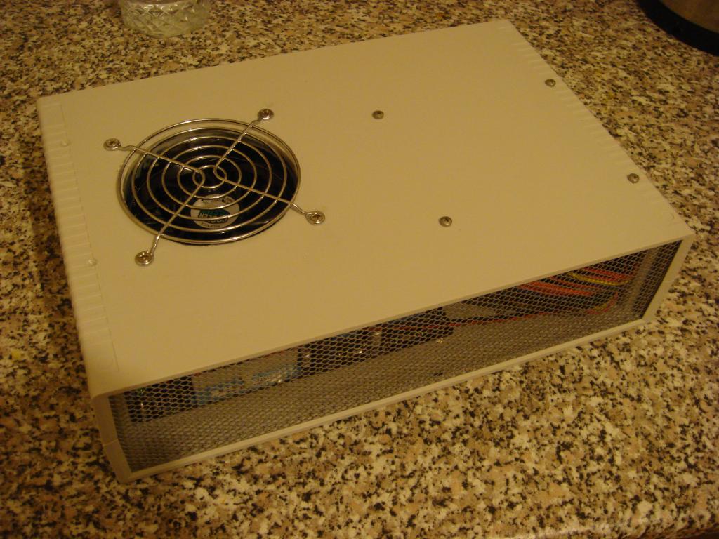 в результате получаем вполне «съедобный» для моих нужд корпус, (кстати передняя вставка корпуса была заменена сеткой), магазинный корпус под материнку формата miniITX использовать не стал, слишком «толстая»: