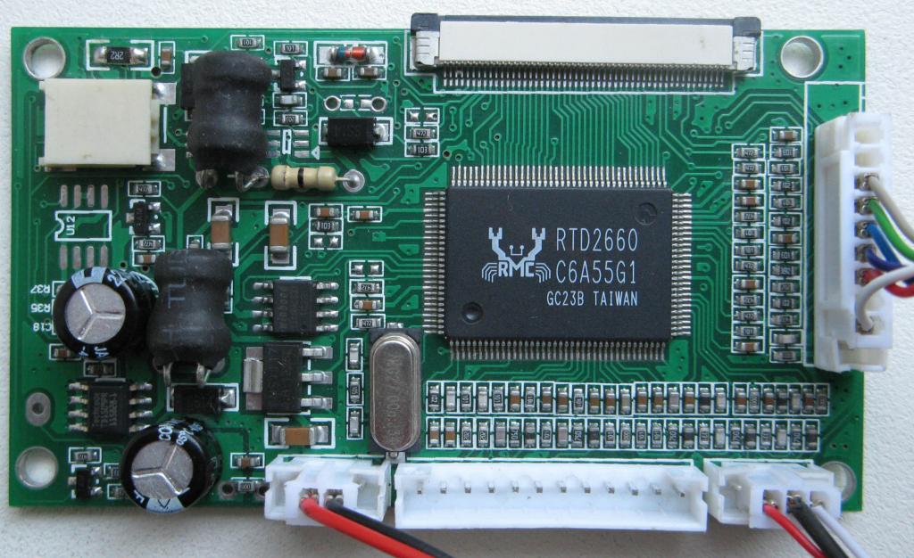 Первым делом занялся прошивками. Ради экспериментов были проверены прошивки на 800*480 TTL, 800*600 TTL, 1024*600 TTL и 1024*600 LVDS. Какие именно матрицы пробовал - не буду перечислять, даже не знаю их названий и лень переписывать, короче какие то китайские аналоги общеизвестных китайских аналогов. Прошивки - именно для этой платы (PCB8000066). Параллельно проверил работу тех же матриц на "народном" контроллере - без нареканий. Прошивки для него брал из того же источника, что и для сабжа, к тому же датированы они одним и тем же числом что для PCB...066, что для РСВ...099. Тем самым свел к минимуму фактор "разных авторов". Вывод: шумность изображения идет не от прошивки, а по каким то другим, скорее всего питающим цепям. Подкинул конденсатор по питанию +3,3В - без результата. На всякий случай подкинул внешнее питание +3,3В - то же самое. При исследовании платы насторожило, что в качестве датчика тока подсветки установлен резистор 2,2 Ом, а не 1 Ом, как во всех контроллерах, где драйвер собран на PT4103. К тому же резистор запаян не на заводе (видно на фото в шапке). То есть китайцы самостоятельно пытались как то исправить ситуацию, но не вышло... Всучили как есть. Чтобы снять подозрение на драйвер, я его заменил на совершенно другой (LS1230) - результат тот же. Замерил напряжения - VGH = 4V, VGL = -3V, AVDD = 3,1V, Vcom=3.3V. Вот и первая засада. По даташитам VGH должно быть 12...19В, VGL -6...-12В, AVDD 4...5В. Опираясь на схему "народного", сверяю платы и проверяю первое подозрение - проходные конденсаторы выпрямителей VGH и VGL, емкость которых должна быть 0,047...0,1 мкФ на деле оказались по 1000 пФ. И это сделано НА ЗАВОДЕ!!! Поменял на "правильные" - появились правильные напряжения VGH = 15V, VGL = -6.8V, AVDD = 8V. Потрясающе - изображение улучшилось, но совсем незначительно... Копаем дальше... При более тщательном исследовании платы обнаружилось, что на выходе цепи AVDD вообще отсутствовал фильтрующий конденсатор (хотя место для него есть), а на выходе цепи Vcom фильтрующий конденсатор хоть и присутствовал, но вторая его обкладка вместо массы оказалась подключена к цепи, уходящей на нераспаянные элементы и просто висела в воздухе. Поставил на место недостающий конденсатор, кинул проводком на массу свободную ножку второго конденсатора и контроллер ожил - изображение прекрасное. Вот такой подляк кинули наши китайские друзья... И самое удивительное - это ведь плата с завода, с заводской пайкой, а вот так изготовлена. |