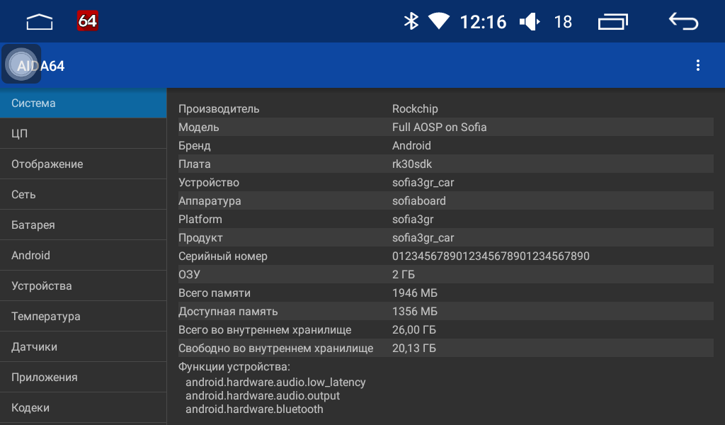 Как и всегда картинки снаружи можно посмотреть тут. Магнитола от JOYING на RK3188 тут. Тема на 4PDA. Тема на XDA. Обновления от производителя. Внутренности: Маркировка на модуле процессора 2G-32G - 2GB ОЗУ и 32GB флэша Обратная сторона модуля процессора, все интегрировано на ней: USB 2.0 4-х портовый хаб FE1.1s, мультиформатный цифровой видео декодер ADV7181D, аудио процессор BD37033FV Дисплей известной марки и с хорошей яркостью. Плата универсальная, она-же подходит и для 10.1" Усилитель мощности конечно же китайский TDA7388 Магнитола имеет две настройки работы при подаче-снятии АСС: - полное выключение - режим сна В режиме полного выключения после отключения АСС через ~40 сек магнитола выключается, ток потребления от BAT при этом ~1.5mA. При подаче АСС время загрузки ~36 секунд. В режиме сна после отключения АСС через ~60 сек магнитола переходит в режим сна, ток потребления от BAT при этом ~11mA. При подаче АСС время пробуждения ~1 секунды. Из 32GB памяти всего места 26GB, доступно ~22GB. После загрузки ОЗУ свободно ~1.36GB Ссылки на описание некоторых настроек (будут дополняться): Управление подсветкой сенсорных кнопок и алгоритмы их работы