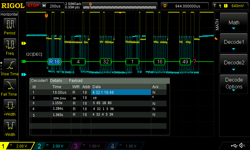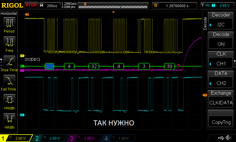 получилось принять "запрос" и в зависимости от значения ответить. Но нужно еще раз отправить сообщение мастеру а как "дернуть" пин СRQ еще раз не знаю, да и время когда он от минуса опять в плюс переходит не то что нужно. на картинках видно, что поднимается в 5вольт на середине сообщения. delay не подходит чтобы управлять CRQ, так как вешает отправку между addres и data. millis не работает (не умею им пользоваться).
