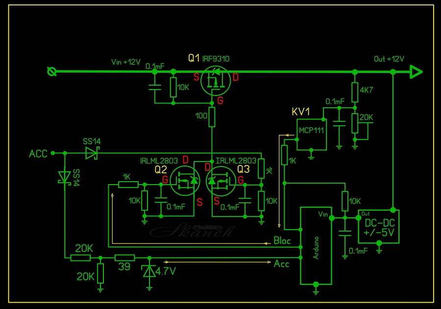 Это проверенная схема с управлением от Ардуино и отслеживанием напряжения на входе средствами супервизора MCP111. Твердотельное реле CPC1117N нормально-замкнутое, "BLOC" - это блокировка от Ардуино, ACC - это наличие/отсутствие напряжения на одном из "пинов" Ардуино для отслеживания его присутствия.