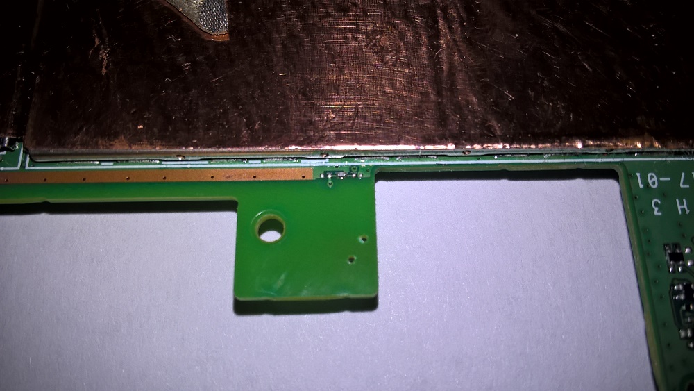 Теперь к выводу на разъёме "корпус" паяем перемычку на ближайшую "массу" на мат-плате и через второе отверстие в плате припаиваем провод питания, который будет подключён к +5V (выбор источника питания нужно делать с учётом его отключения, когда планшет уходит в "сон" для снижения энергопотребления).