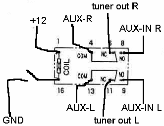 Прошу прощения за ввод в заблуждение - маркирровка реле BT-12S, думаю вы без труда его найдете. питани прямо с разьема питания мафона внутри взято. А земля комутируется но схеме через транзистор. Кстати переделывал штатную голову Европейского аутбека и 6-дисковым ченджером, сервис-мануал тоже есть, но к сожаления так и не смог найти правильные выходы тюнера - уж очень там все запутано. Сделал через выход кассетного мафона. Одно неудобство - пришлось вставить кассету которая постоянно крутится во время использования AUX. |
