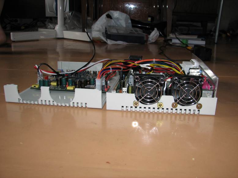 1. Рамку таки перекрасил той же краской body для бамперов. Надо было ее лучше встряхивать в первый раз :-). Но решил на всякий случай досушить ее. Засунул в духовку, выставил самую низкую температуру. Когда через час достал, офигел. Рамку всю вывернуло. Она стала в меру пластичной! Согрел еще раз, придал нужную форму и охладил в таком состоянии. Итог - рамка почти нужной формы :-). 2. У материнки intel gly таки есть режим когда скорость вентиляторов зависит от температуры! Но эта феня распостраняется только на второй разъем питания вентилятора. И, похоже, материнка при этом опирается не на температуру проца, а на температуру чего-то другого. 3. Почти сделал корпус для компа из чип-и-диповского РЭА корпуса. Планирую прямо в корпус поставить усилитель для колонок (производства masterkit). Дело в том, что обычно я слушаю звук только из передних колонок и нормальный усилок у меня стоит только на них. На зад раньше играл усилок магнитолы. 4. В корпусе два вентилятора будут втягивать воздух в корпус, прогонять его мимо материнки (один дует почти прямо в процессор, так что подумываю выключить кулер на проце), затем часть воздуха будет выходить, проходя мимо жесткого диска, а часть - мимо радиатора усилителя. Посмотрим что из этого выйдет. Вентиляторы мощные, 2W каждый, 5 см в диаметре, 1.5 в толщину. На всякий случай, вентиляторы взял с обоими шарикоподшипниками. Осталось закрепить звуковую плату, провести провода питания-колонок, да закрепить усилитель с радиатором. Надеюсь, через пару дней сделаю, тогда и фотки выложу, что да как. Основная проблема была - разместить звуковую плату creative live 5.1. Пришлось от нее отрезать game порт . Иначе не умещалась...Разъемы питания и колонок буду использовать стандартные Din, как у магнитолы. И питание собираюсь использовать штатное. Только землю сделаю нормальной... Ток простоя у системы явно небольшой, Точно знаю, что даже загрузку системя нормально тянет импульсный блок питания 12 вольт 2.5 А. Правда это без монитора.